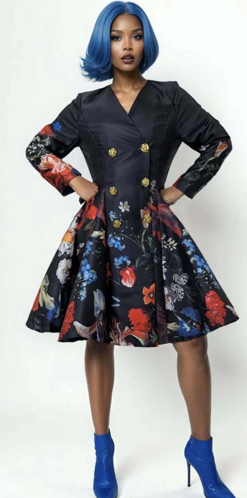 A tailored, fully lined design with structured shoulder pads, gold button accents, and functional pockets. Long sleeves and a collarless neckline bring a modern twist to the classic floral print.