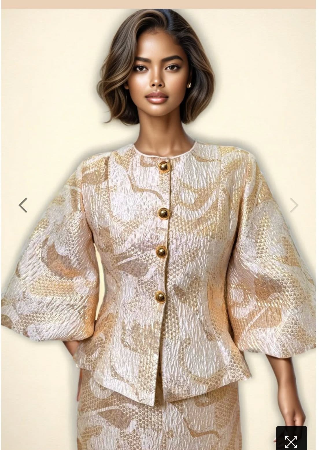 Shimmering gold set featuring a textured jacket top with puff half sleeves, gold buttons, and round neck. Paired with a knee-length skirt with a side zipper closure and center back slit. Fully lined and finished in rich multi tones.